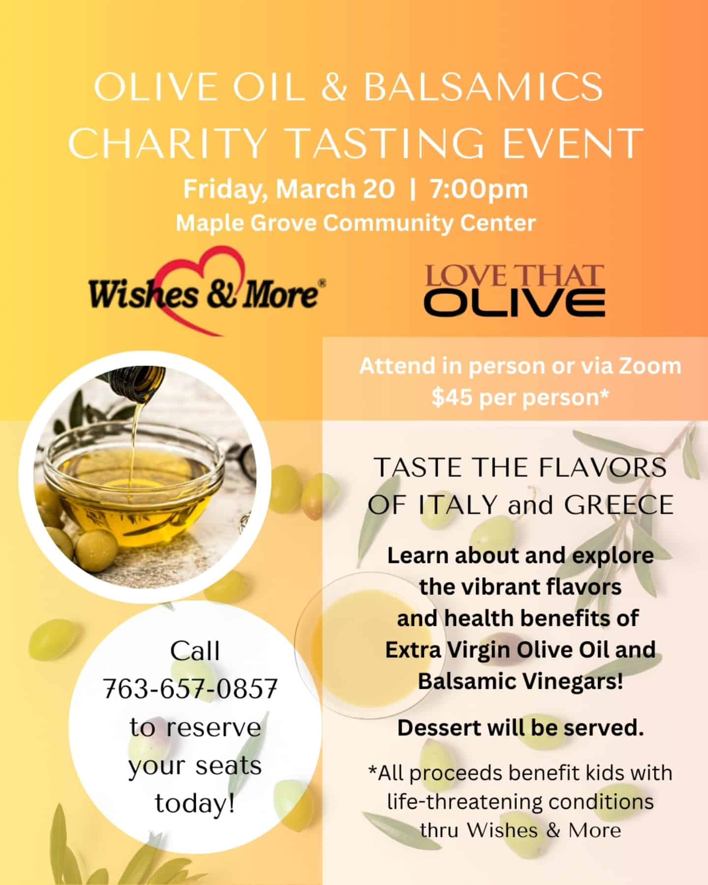 Taste the Flavors of Italy and Greece! Learn about and explore the vibrant flavors and health benefits of Extra Virgin Olive Oil and Balsamic Vinegars! Invite your friends! In person at the Maple Grove Community Center or over Zoom. All proceeds benefit Wishes & More. Go to https://www.lovethatolive.com/ to sign up, order a tasting kit […]